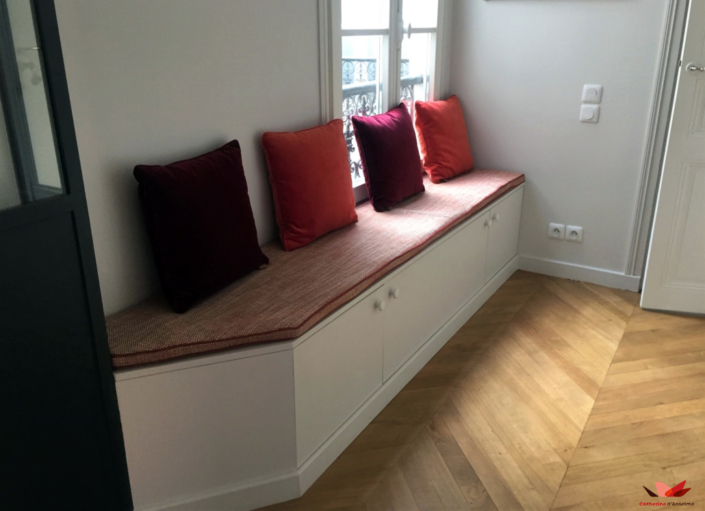 Nous avons crée une banquette sur mesure et son coussin tissé et surligné, en écho au mur en briques de la cuisine.