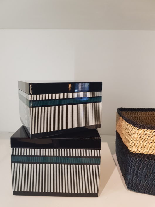 Les lignes se déclinent dans les accessoires de décoration, notamment les boîtes en bois laqué.